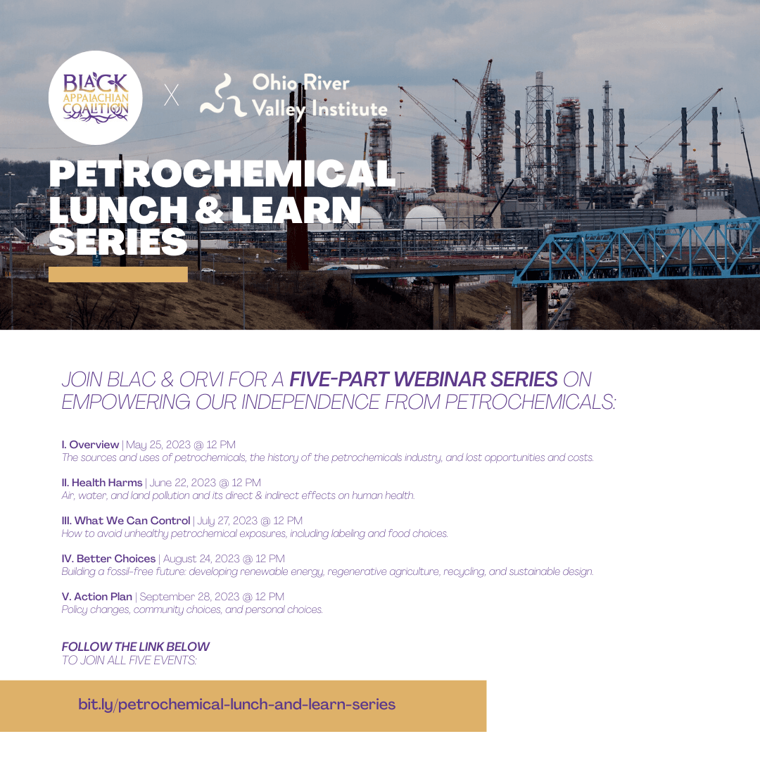 This summer, join the Black Appalachian Coalition- BLAC and Ohio River Valley Institute (ORVI) for a lunch & learn series on the impacts of petrochemical development on Black communities in Appalachia. To register, click here: bit.ly/petrochemical-lunch-and-learn-series